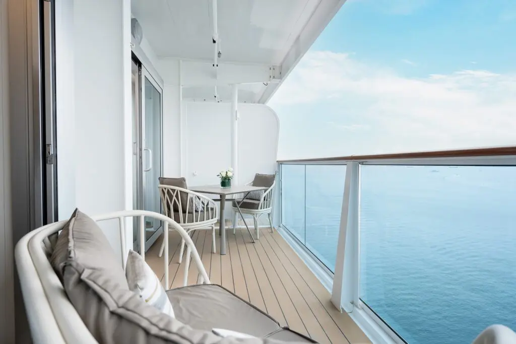 Staterooms: Suites, Mini-Suites, Balcony, Oceanview, Interior; spacious layouts, some with large balconies.